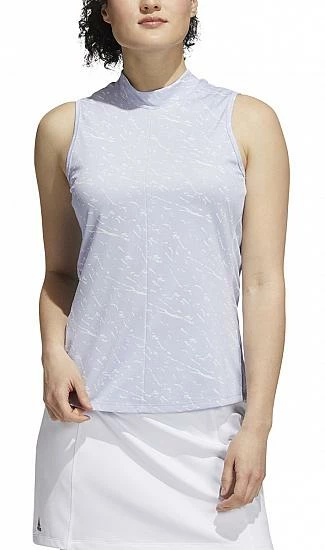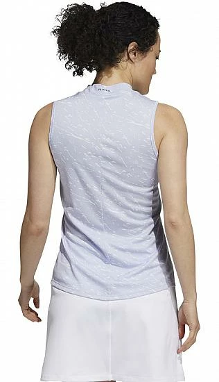 Adidas Women’s Primeblue Sleeveless Golf Shirts feature a mock-neck design and the Adidas brandmark on the bottom right hem.