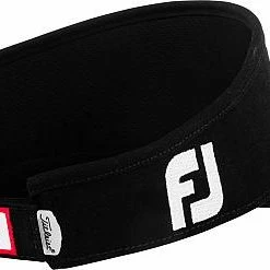 The front of these golf visors has the embroidered Titleist script logo, the left side features embroidered Pro V1 and FootJoy logos and the back has a Titleist patch logo on the back closure.